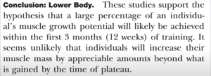実際これは科学的に裏付けられています。2017年のアメリカで行われたレビューペーパーではすべてのトレーニーが絶望する声明が発表されました。このレビューでは複数の研究デ-タをまとめて筋肉が停滞するまでにかかる時間を調査し、筋肉の成長の時間経過を調べる一連の研究に基づいて筋肉の成長の大部分が最初の3か月以内に達成される可能性が高いという結論を出しました。