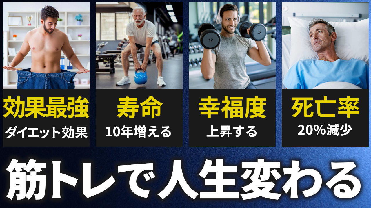 寿命、メンタル、体脂肪、ケガ予防、そして脳と老化。これらすべてに同時に関わっているのが筋肉です。有酸素運動をはじめとしたほぼすべての運動よりも筋トレは筋肉の量の維持や増加において効果が高い、つまり最強です。