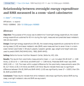 古い研究では夜間の代謝率は日中のものとほとんど変わらないことを示しており、2002年の研究では肥満者の睡眠代謝率は日中の安静時よりも低い傾向にあるが、それでも実際には健康的な非肥満者の安静時よりも代謝率は高いこと、そして研究者は睡眠時の代謝率と覚醒時の代謝率は基本的に同じであると主張しています。