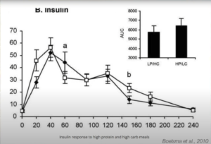 まず、そもそも炭水化物や糖質だけがインスリンの急激な上昇の理由にはなりません。例えばある研究では高炭水化物低たんぱく食と低炭水化物高たんぱく食で比較をしたところ、インスリンレベルは同様に上昇していることを発見しました。