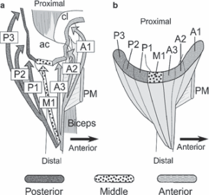 基本的には前部は腕を前に出す。中部は横に出す。後部は後ろに引くと考えてもらえればOKですが、解剖学的な役割が重複していることに注意してください。例えば肩関節の屈曲は前部と中部、水平外転は中部と後部が働きます。これは筋肉の活動を調べた研究でも明らかです。