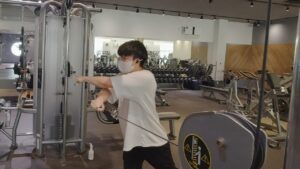 ケーブルを後ろに通すと肩が中立的な位置に固定されてずっと中部が横を向いている状態になります。これによってサイドレイズの負荷が中部に集中します。