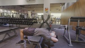 まず1種目目、クランチです。床でもいいですが、できればベンチやソファ、なければ少し高さのある場所に寝て、背中を少しだけ浮かせる形で行います。