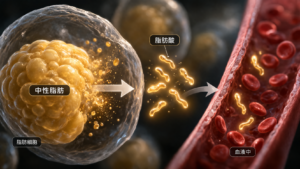 脂肪はそのままではエネルギーとして使えません。まず脂肪細胞の中にある中性脂肪が分解され、「脂肪酸」として血液中に放出される必要があります。この過程を「脂肪分解」と呼びます。