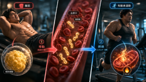 脂肪は低〜中強度の運動で燃えやすくなります。高強度では糖質の利用が中心になりますが、軽く息が上がる程度の強度では脂肪の利用割合が高くなります。今はすでに脂肪酸が血中に出ている状態なので、このタイミングで有酸素運動を行うことでその脂肪が優先的に使われやすくなります。