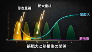 その理由は、トレーニングによって生まれた筋タンパク合成がまず筋線維の修復に使われ、残った分だけが筋肉の構築に使われるためです。損傷が大きいほど修復にエネルギーが取られ、成長に使われる余力が減ってしまいます。