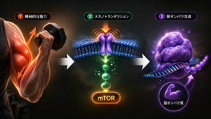 現在の科学的な理解では、筋肥大を引き起こす最も重要な刺激は機械的張力、つまり筋肉にかかる物理的な力です。トレーニングによって筋線維に強い張力がかかると、その刺激が化学的なシグナルに変換され、筋タンパク質の合成が促進されます。この合成が分解を上回ったとき、筋肉は成長します。